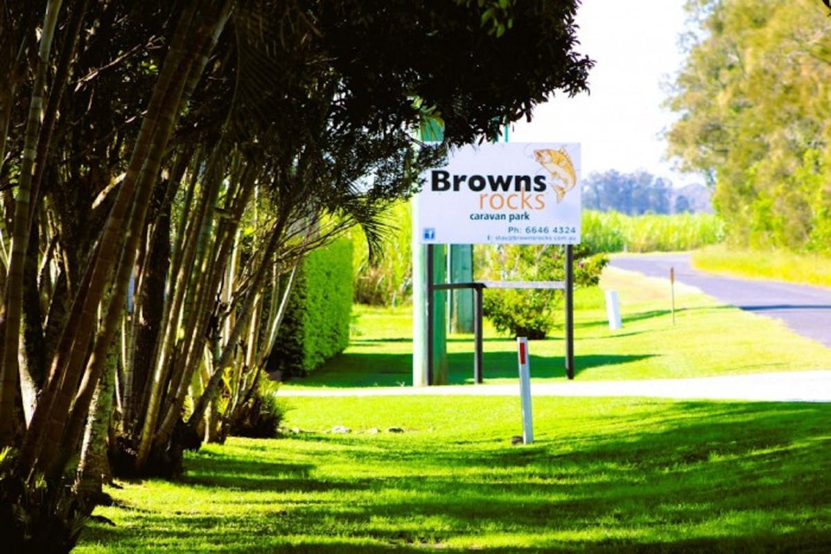 Browns Rocks Caravan Park is only eight kilometres off the highway. Travel along the Pacific Highway and take the Iluka turn-off. Drive four kilometres to Woombah village and turn right at the blue caravan park sign and Goodwood Island Wharf sign. Cross the bridge onto the island and follow the river to the park entrance.