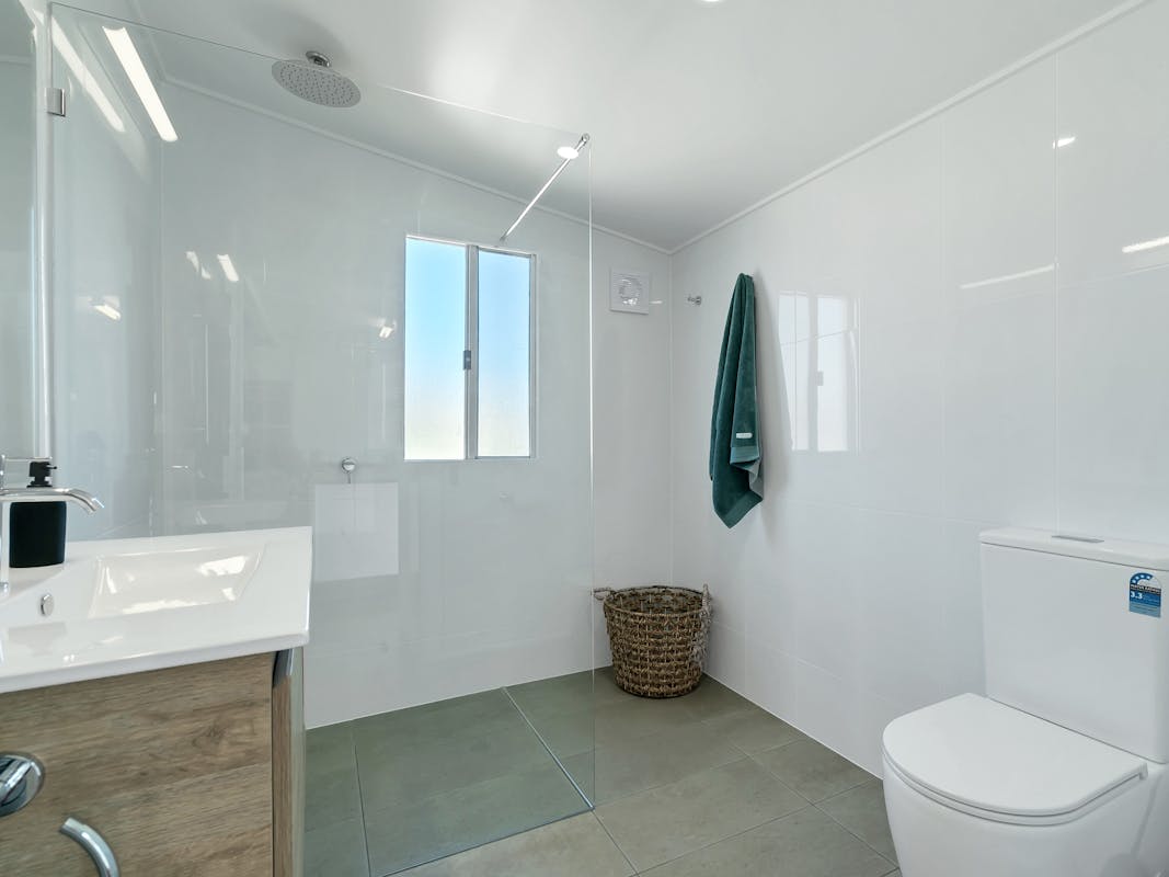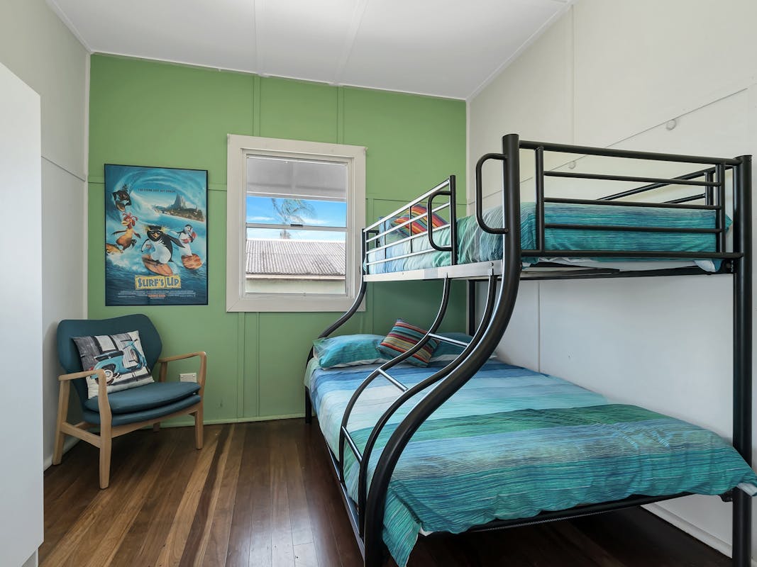 Inside, the space is bright, stylish, and thoughtfully furnished with a fresh beach vibe. The main bedroom features a comfortable queen bed, while the second bedroom offers a double bunk – ideal for families or friends. The large modern bathroom adds a touch of luxury, with a second toilet located downstairs alongside the laundry for convenience.