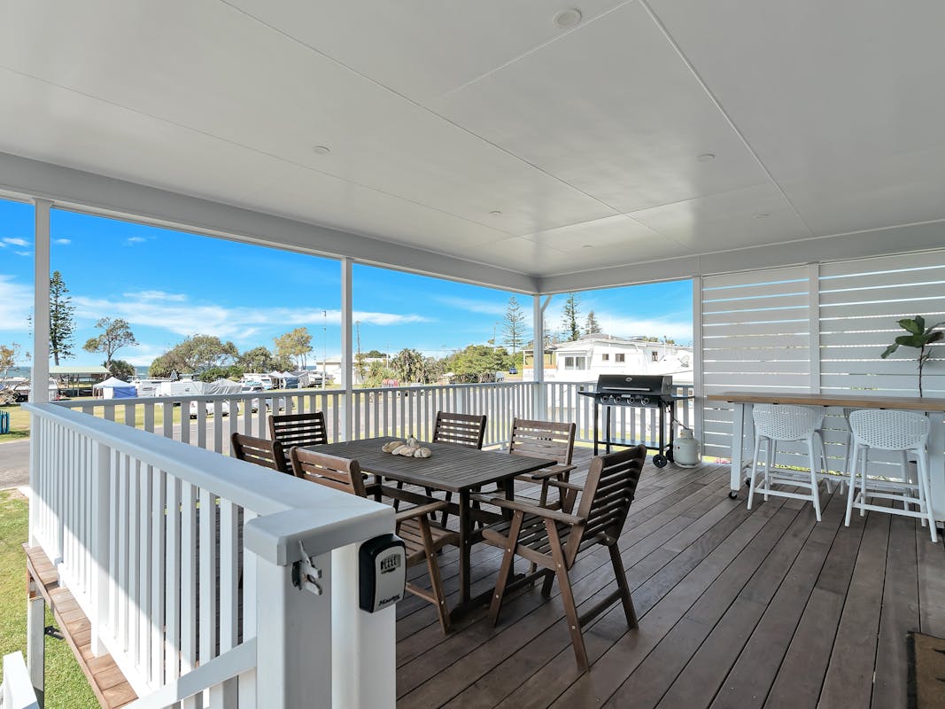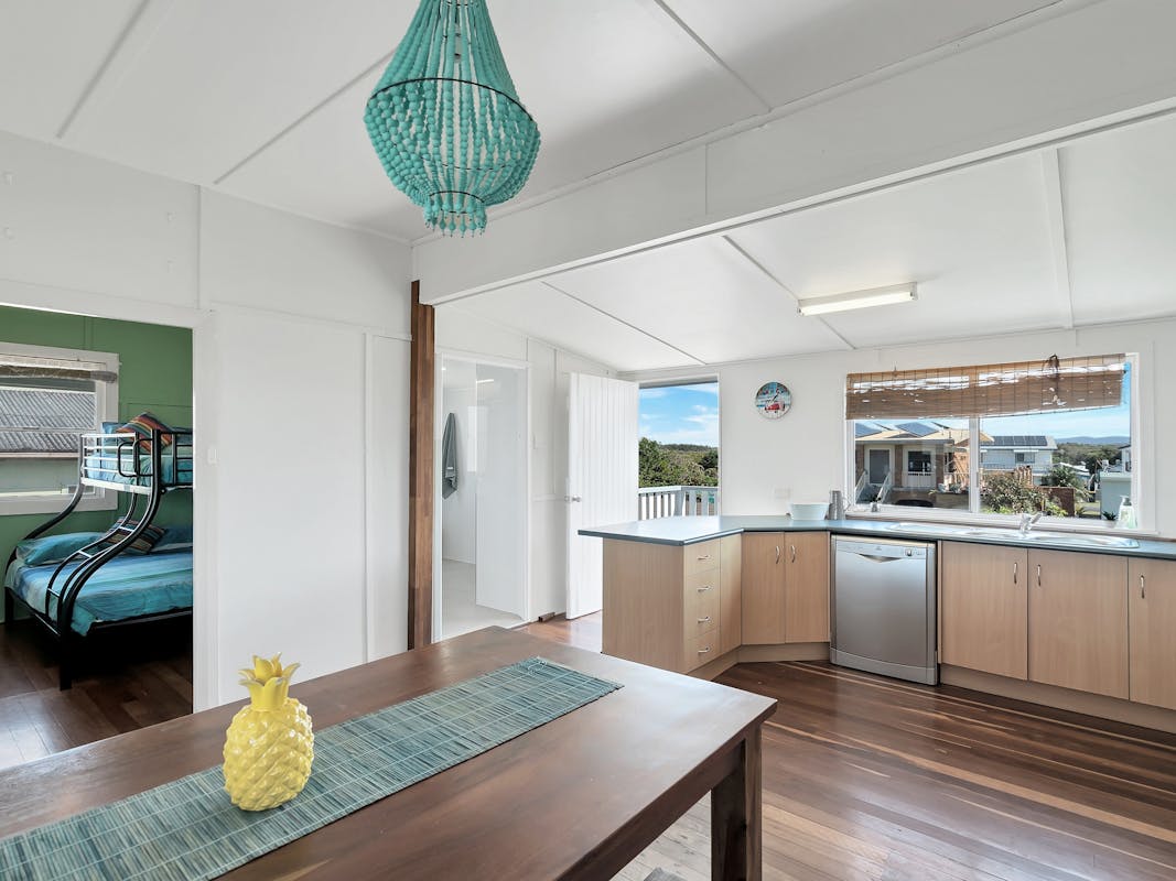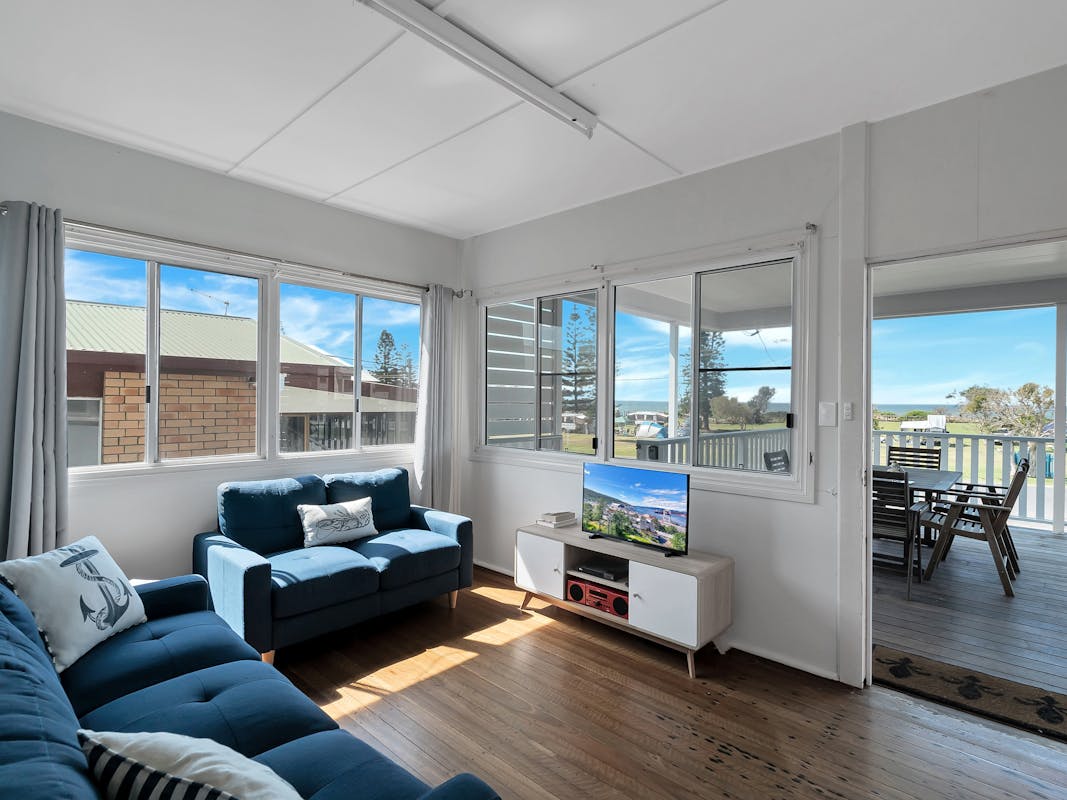 A fully equipped kitchen opens onto the inviting living area and flows out to the expansive front deck, where you’ll enjoy panoramic views over Brooms Head and the sparkling Pacific Ocean. Fire up the BBQ, share a relaxed meal, or simply unwind with a drink as the sea breeze drifts by.