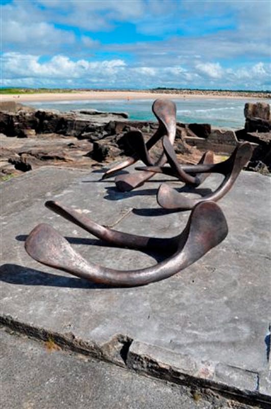 Cass Samms ‘Furcula’ 2011 is four stylised bronze wishbone pieces that interconnect with one another creating an interactive space. The sculpture which is approximately 1.6m wide, 2.7m long and 1m high sits on the edge of the rocks overlooking the beach and river crossing.
