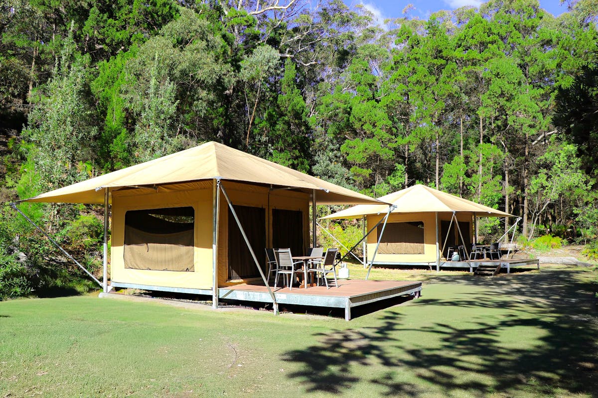 The park features a small village of cabins, safari tents, caravan and campervan sites, set within natural surrounds. For a more immersive experience, the extensive bushland campground offers secluded sites and open campfires, delivering a true camping adventure with the added comfort of clean amenities, hot showers, toilets and a camp kitchen.
