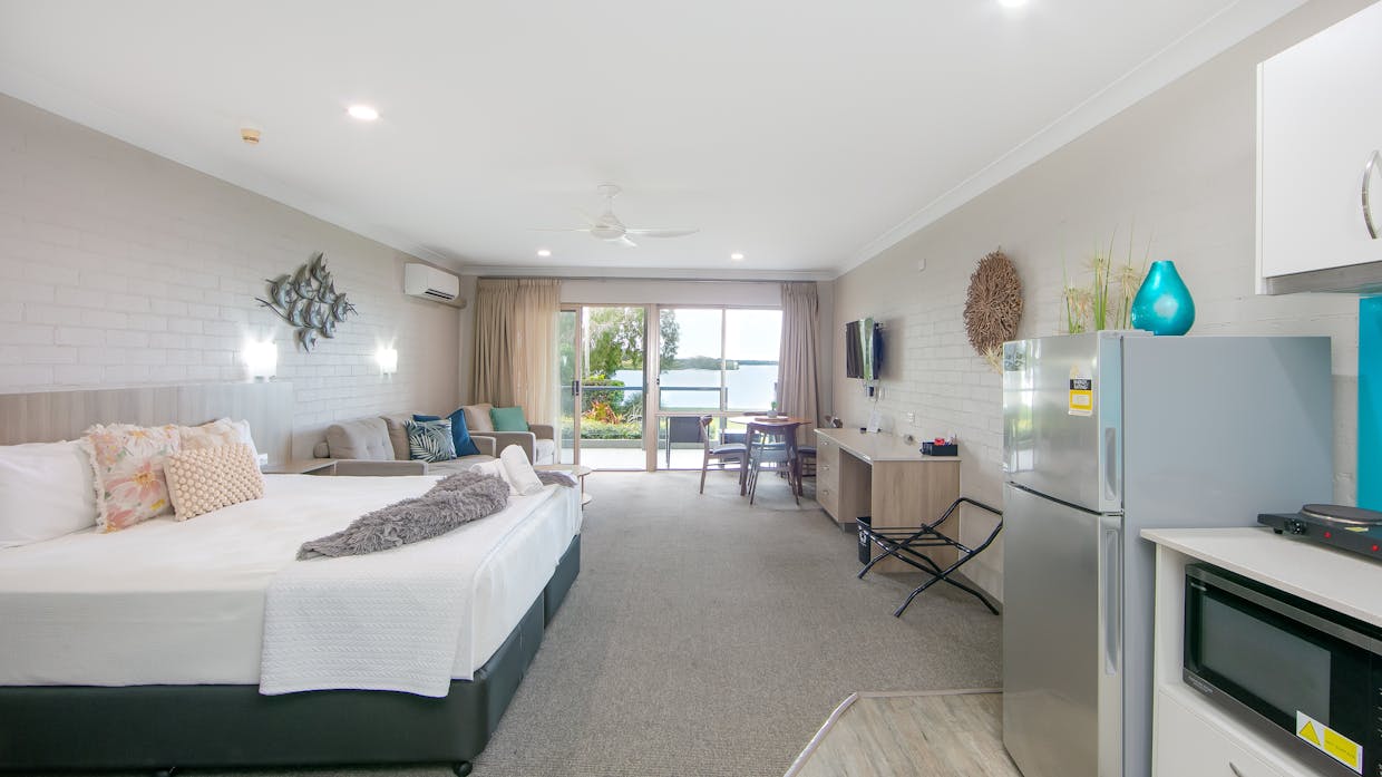 Moby Dick Yamba offers 22 guest rooms all with balconies overlooking the beautiful Clarence River and also 3 three-bedroom fully self-contained townhouses. Overnight and extended stays are catered for in the spacious self-contained rooms. In addition three fully self-contained two story townhouses including kitchen and laundry facilities are available ( these do not have water views)