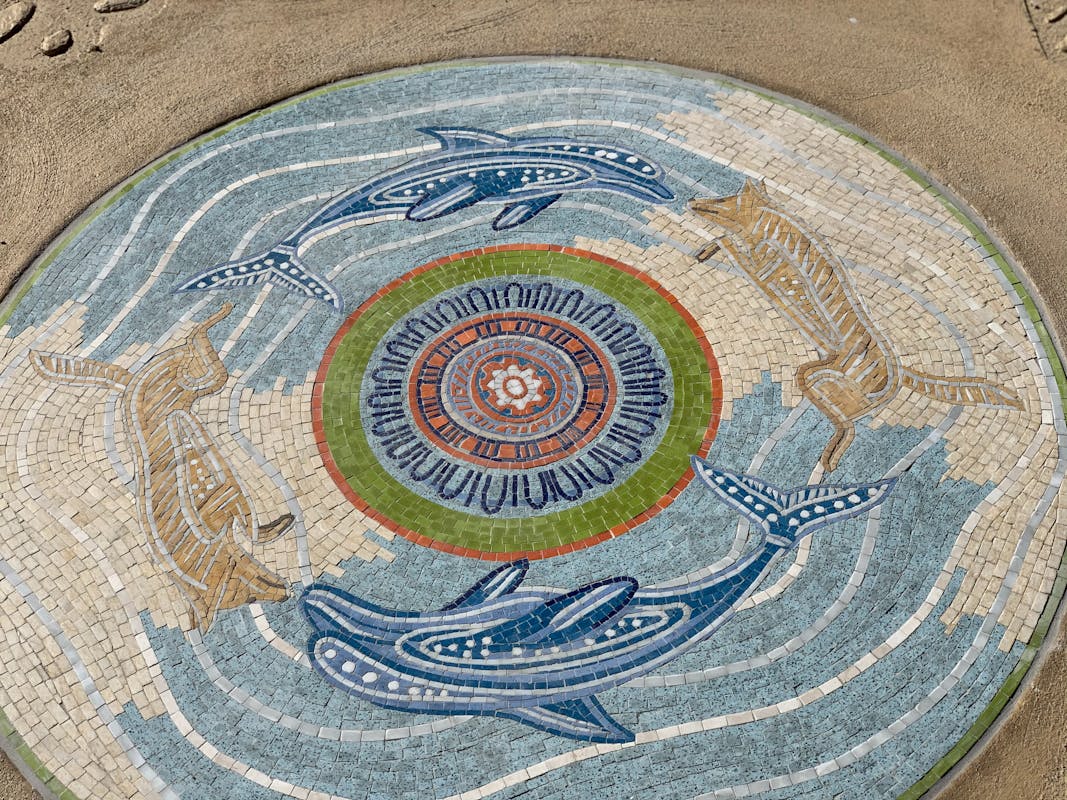 Incorporating a mosaic featuring two totems (dolphin and dingo), six Language Poles, and three Yarning Circles, the garden sets the tone and focus for Yaegl story telling.