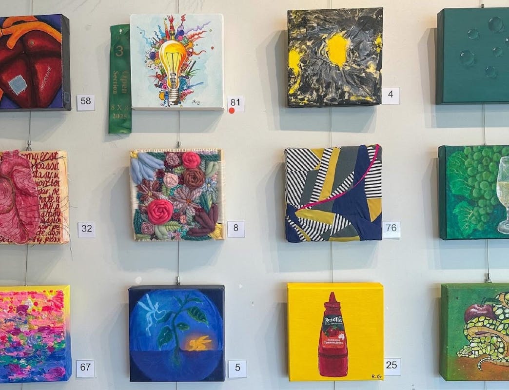 All works, on the given eight inch by eight inch canvas, tells a story, inviting viewers to engage closely with the given theme for the 2026 exhibition.