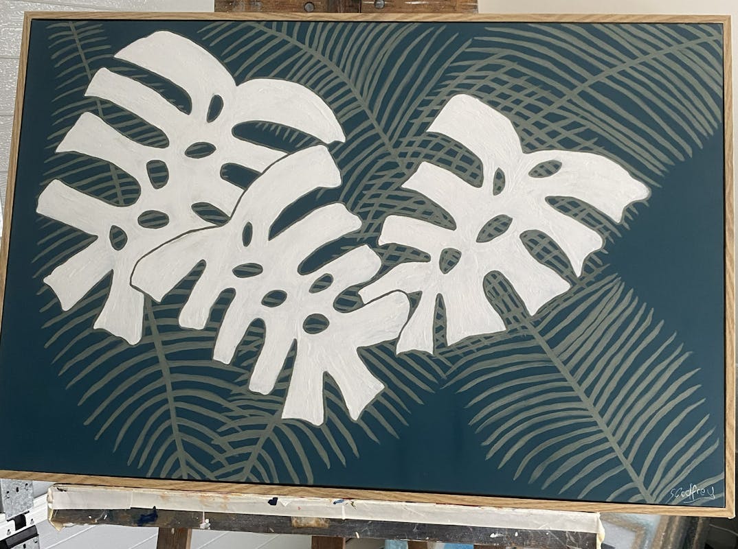 Each piece is framed and affordably priced. Sue has a background in textiles and textile design working with silks, ribbons and acrylics and exhibiting at the ‘Di Watt Gallery’ on Tamborine Mountain, QLD. Building a reputation as an interior stylist she found herself creating large artworks to suit the décor, drawing inspiration from cushions, rugs, etc, connecting the client to their surroundings. Her styling and artwork was featured at the ‘Songbird’ Restaurant.