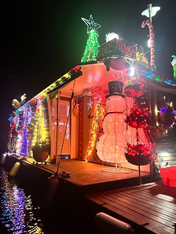 Each evening, the boat either anchors in easily accessible spots or cruises the local waters, shimmering with festive lights. Santa takes his place on the front deck, playing Christmas carols and waving to families, friends, and strangers drawn to the glow.